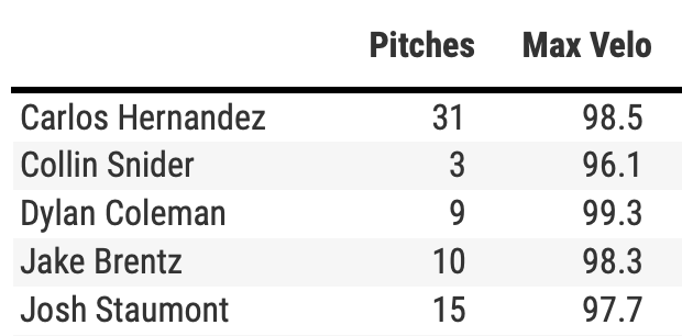 Dylan Coleman had a Coleman-esque outing, pumping 98 mph four-seamers up in the zone and complimenting that with a wipeout slider at the bottom. Fifteen pitches, eight swings and four misses. A 47 percent CSW% (Called Strike Plus Whiff Percent) will lead to a lot of clean innings.