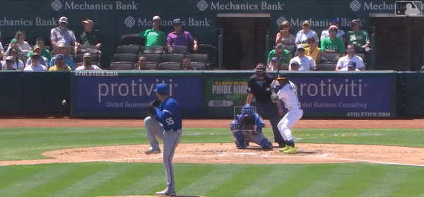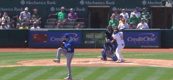 The A’s, to their credit, battled against Ragans. He generally required around 15 pitches to get through an inning. His first couple of pitches in his sixth and final frame were down in velocity to around 95-96 MPH. (I’m laughing that I just wrote that sentence.) Somehow, he found that final bit of adrenaline to get across the finish line. This was his final pitch of the afternoon.