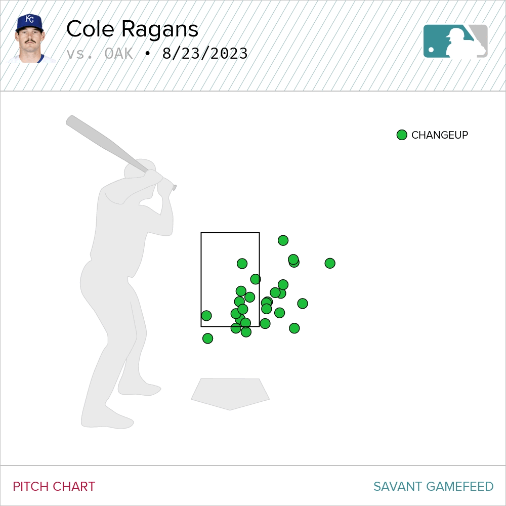 Man cannot live on fastballs alone. Even ones that spin and explode. The chase pitch for Ragans was his changeup, coming in at a healthy 86 MPH, representing about 10 MPH of separation from his fastball.