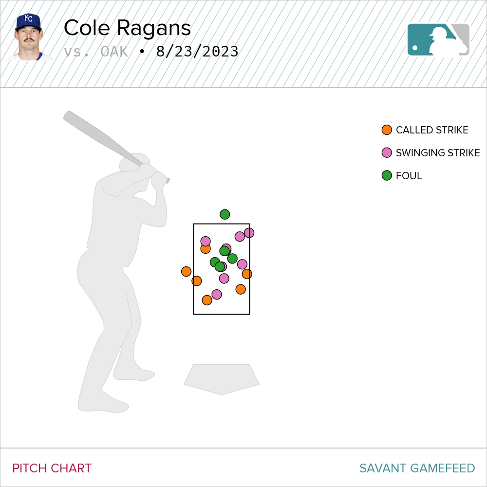 I mentioned that the changeup was Ragans’ chase pitch. Of the 27 he threw on Wednesday, 15 were out of the zone, but Oakland hitters went after 40 percent of them. Yes, it’s a small sample but it was the pitch where Ragans had his highest chase rate. Overall, he had seven whiffs on the change.
