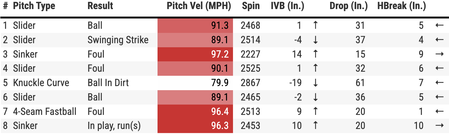 A foul on a four-seamer, and then came the elevated sinker that Witt drove just out of reach of the shortstop. Like I said, this was the at bat of the game.