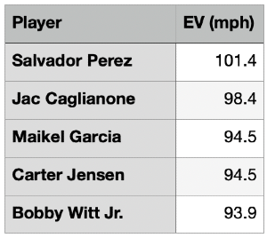Among Royals with more than five measured batted balls, here is the current Royals exit velocity leaderboard: