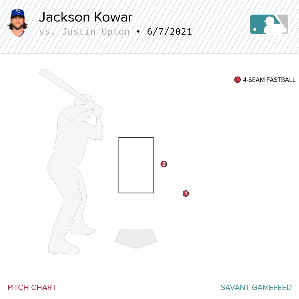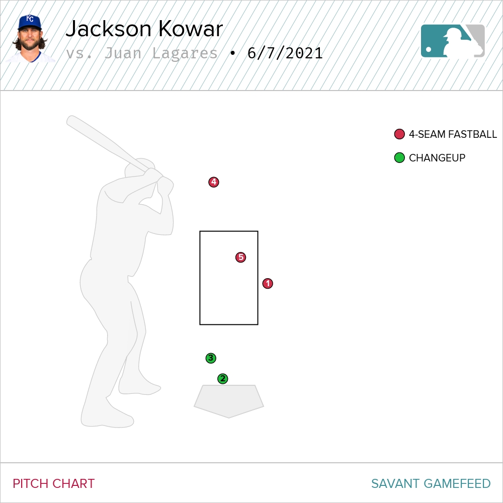 As I was planning this edition of the newsletter, I figured it would be fun to chart Kowar’s night via Baseball Savant, following along as he popped mid-90s heat with a plus-plus change. He had thrown 90+ pitches a couple of times for the Storm Chasers as he absolutely sliced through Triple-A East in his first six starts of 2021. I hoped he could be economical enough to navigate through five innings.