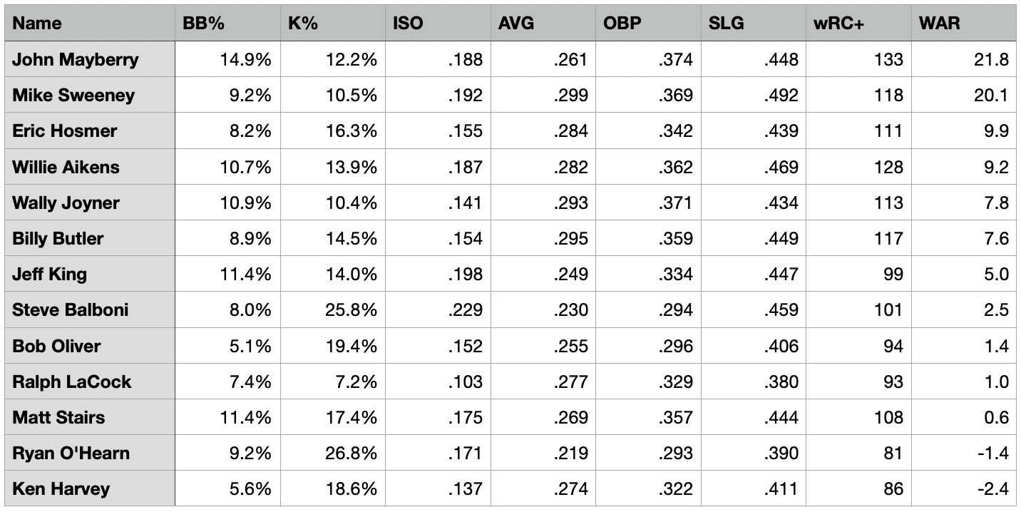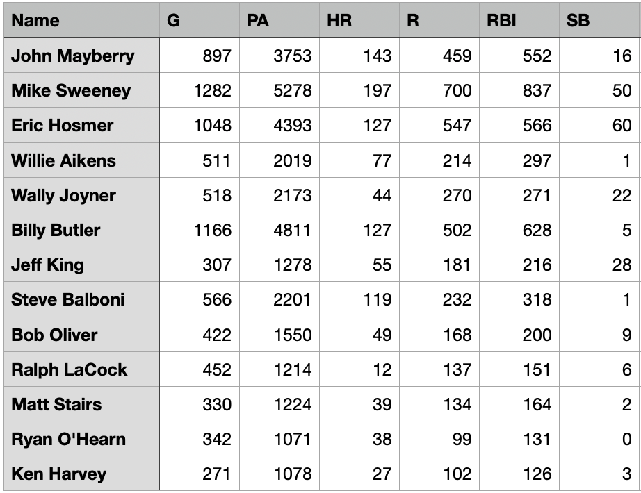 To gain a little perspective on Hosmer’s Royals career, I wanted to look at players who were primarily first basemen and who had at least 1,000 career PAs for the club. It’s an interesting mix to be sure.
