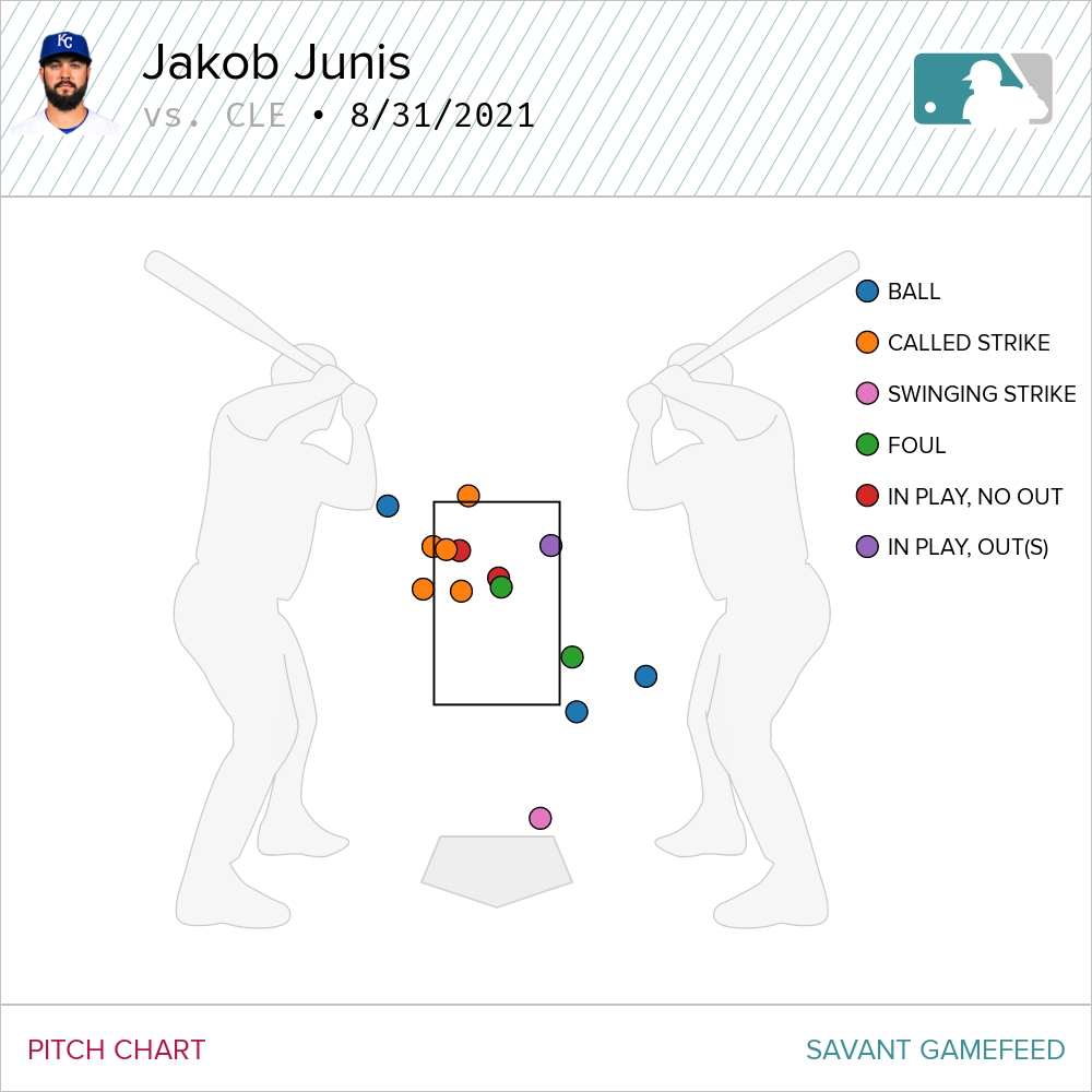 The slider was his big swing and miss pitch—five of the 12 swings Cleveland batters took caught only air. They fouled off another three. After the game, Junis expressed satisfaction with the slider: