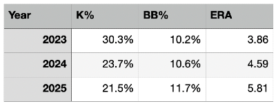 The sinker had been the primary offering of his fastballs in ’23, but in 2024 he relied much more on his four-seam. Alarmingly, both offerings saw another decrease in velocity, averaging 92 mph.