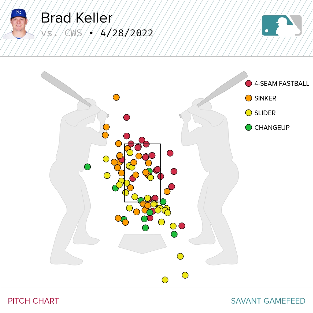Very few mistakes and a lot of contact on pitches low in the strike zone. And while it’s not always true that contact on low pitches results in ground balls, in Keller’s case, it generally is. He recorded 12 ground ball outs to two fly outs.