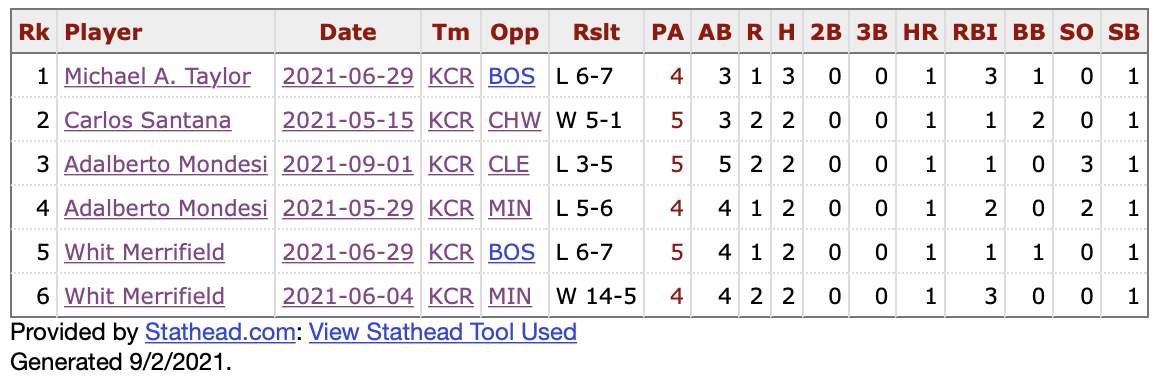This tweet from Nick Kappel, the Royals manager of communications and broadcasting, let me to Stathead at Baseball-Reference. Mondesi has done hit the home run/stolen base daily double twice in 2021. Here is the complete list of Royals who have done this.