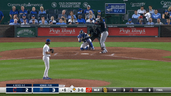 This was just a fantastic return for Kowar. He dealt through the first four innings, allowing a couple of baserunners but he picked off one and got a double play to erase another. Things got sticky in the fifth and sixth. An error from Michael A. Taylor led to a pair of unearned runs in the fifth. (I know the Royals’ broadcast was banging on about how Taylor had a 10 percent chance to make that catch, but that discounts his speed and how he was able to actually reach the ball. It wasn’t easy and he had to run a long way, but he was there and needed to make that catch.) Kowar then escaped a jam in the sixth by striking out back-to-back hitters. Both on changeups. The first gif in this entry was the second strikeout. Because I believe in giving you, the reader, what you want, here’s the first.
