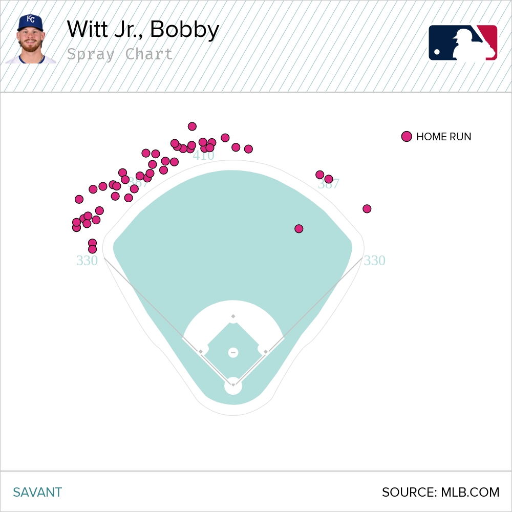 Here’s where Witt has deposited his 46 Kauffman Stadium home runs.