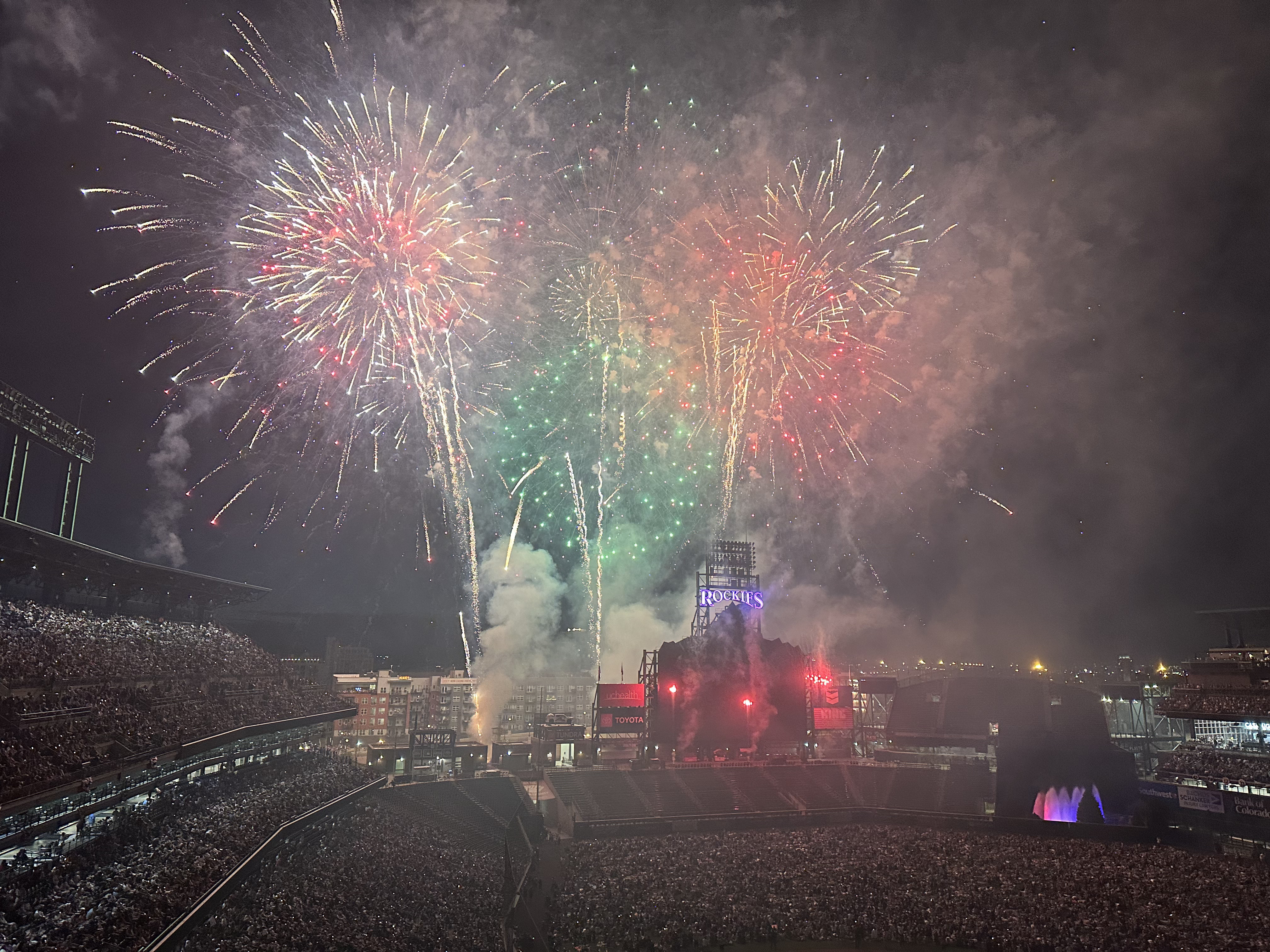 As I was there for the July 4 game, there were postgame pyrotechnics scheduled. Apparently, when this happens at Coors Field, the left and center field bleachers empty out and those fans are allowed on the field. It’s a lengthy process to get everyone resettled. I figured it was because those fans wouldn’t really be able to see the fireworks. I think that’s partially true. The other part of it is, had anyone remained in those seats, they would’ve been incinerated.