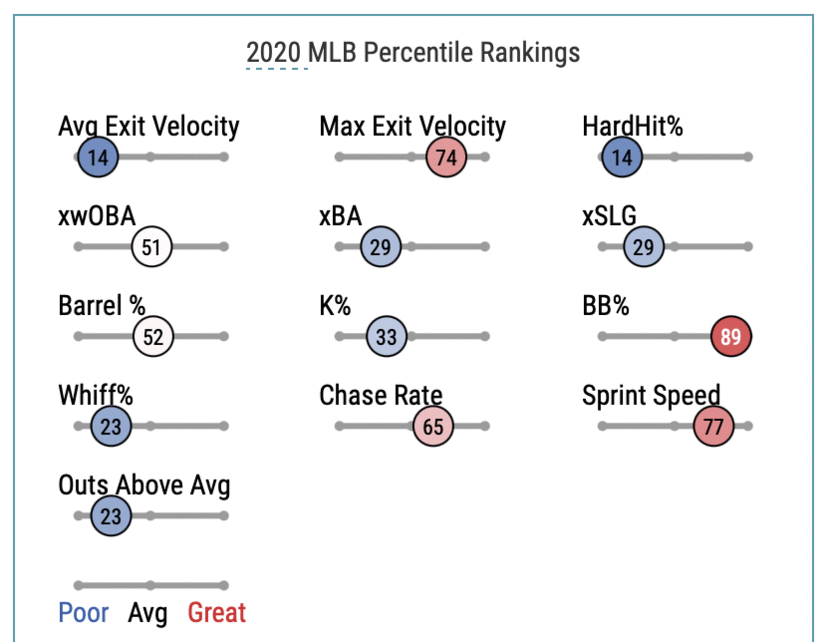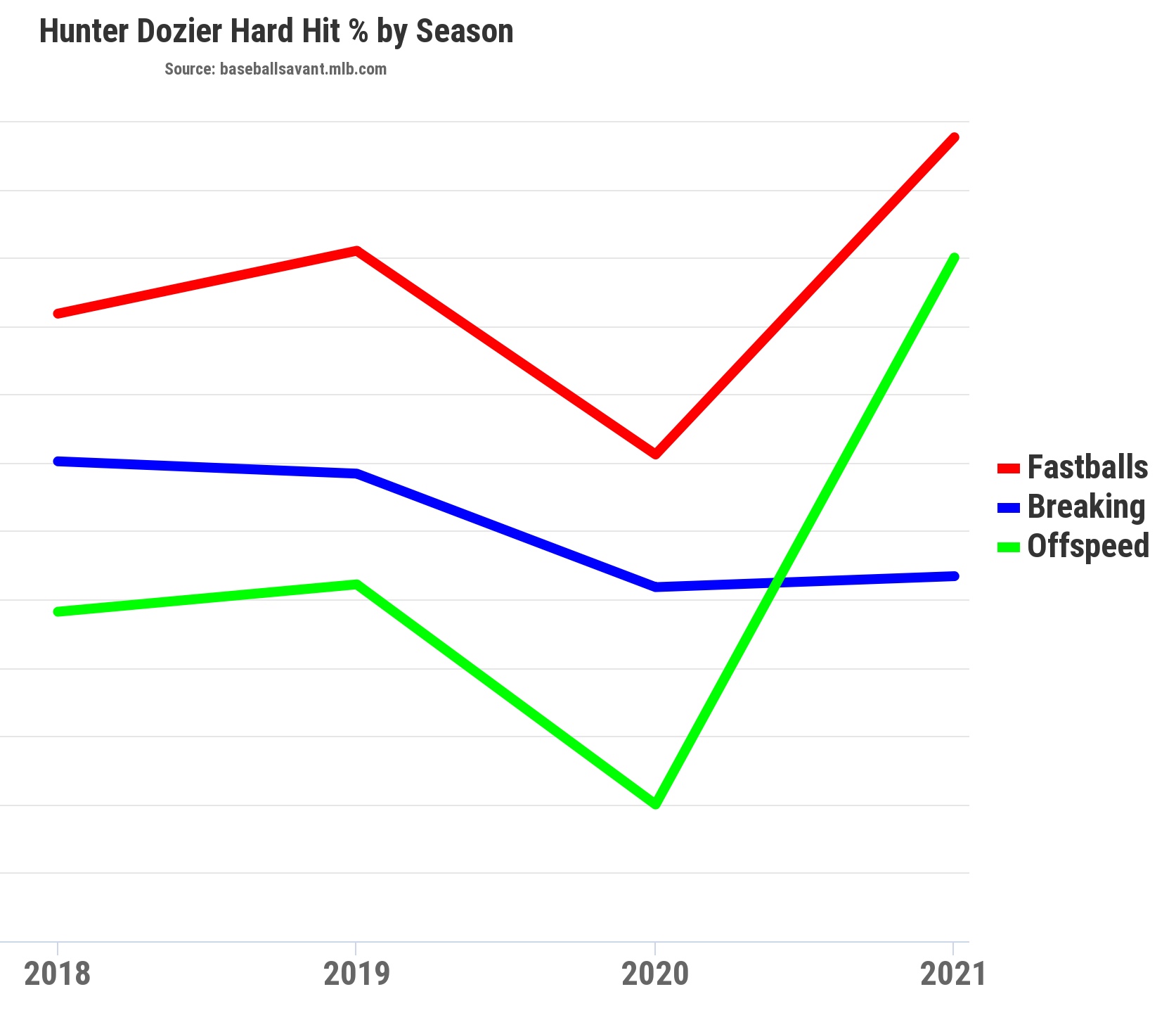 Next, as you would expect, his HardHit% has improved dramatically. He’s hitting a ball harder than 95 mph 49 percent of the time this year. That’s about six percentage points better than 2019. He’s doing most of his damage against fastballs and offspeed pitches.