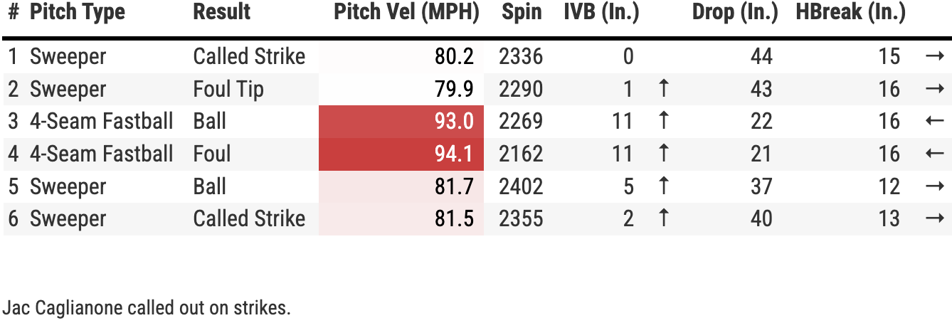 I drop this here not to kvetch about Caglianone. It’s actually a decent at bat against a difficult lefty. Sweepers away and Caglianone spit on a close one to push the count to 2-2. That sixth and final pitch—a sweeper in—would freeze just about anyone.