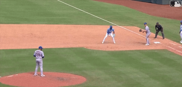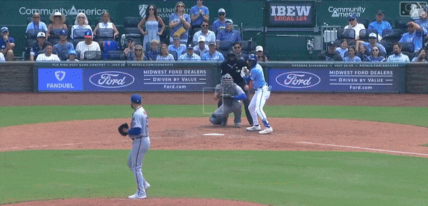 The next batter, Jeff McNeil pounded an Estévez four-seamer to the deepest reaches of the yard. Kyle Isbel was close to making the grab against the wall, but the degree of difficulty was steep and Isbel actually had the ball glance off his glove, a quarter-step too far. The baseball rolled around for a triple. The Mets were in business.