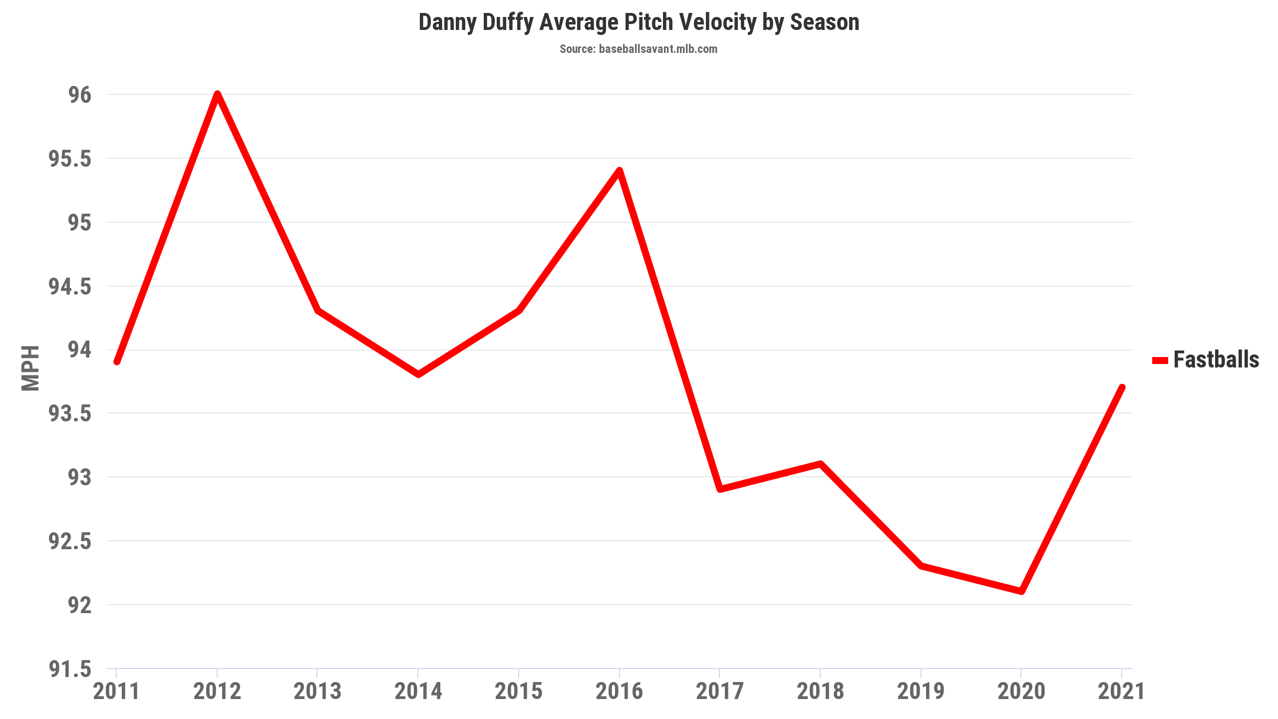 While an increase in velocity can come with an increase in positive results for a pitcher, it can also lead to increased injury risk. His overall velocity on the fastball wasn’t down in his last start last Wednesday. Duffy’s overall fastball average of 93.9 mph was tied for his second-highest in a game in 2021, there was a noticeable dip between the third and the fourth inning.