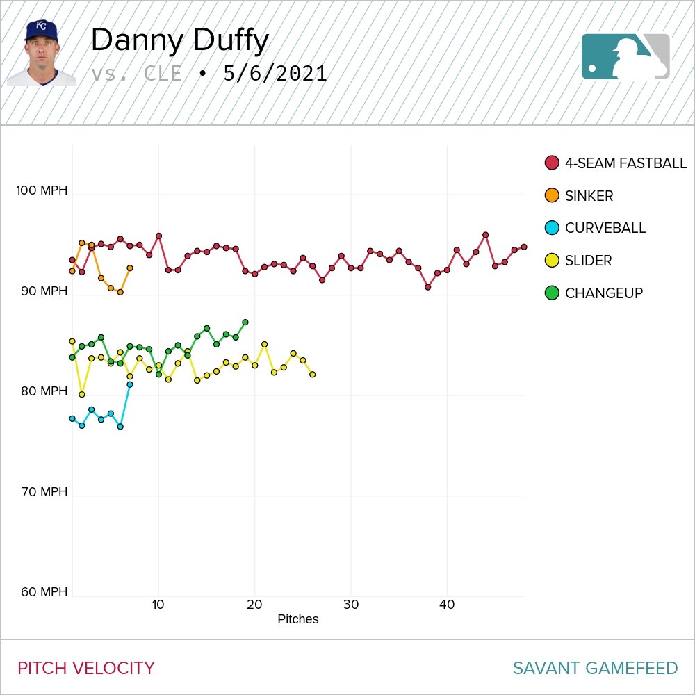 Duffy’s velocity chart from his May 6th start against Cleveland was interesting. There are three distinct “sections” on the velocity of his fastball.