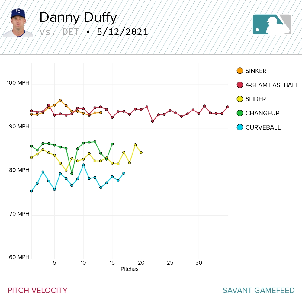 The slowest fastball he threw in that start came on his first one of the fourth inning. This is not some sort of “ah-ha!” moment, where it’s obvious an injury occurred. He was still able to touch 95 mph as he progressed in his start. And the fastballs he threw after delivering his 22nd of the night averaged 93.5 mph. Duffy’s velocity chart in his last start actually mirrors his velocity chart from most of his starts. He’s a guy who comes out bringing almost max effort. His velocity tends to diminish as he goes deeper into games. This isn’t unusual. But it appears Duffy worked this offseason in building up the strength to maintain that velocity. He’s done a really fine job of doing that in most of his starts.