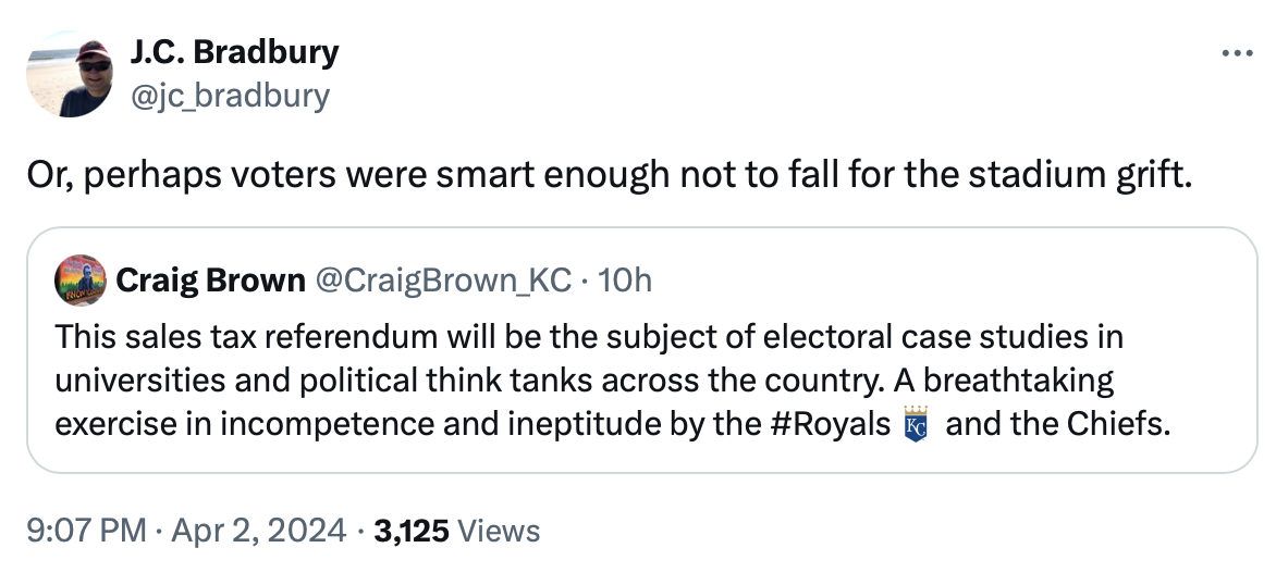 The outcome was supposed to be close. It wasn’t. In fact, the vote was so overwhelmingly against it that I kind of doubt that, had the Royals (and the Chiefs) not continually bungled this process with their version of amateur hour, the initiative would’ve passed. Never underestimate angry voters, indeed.