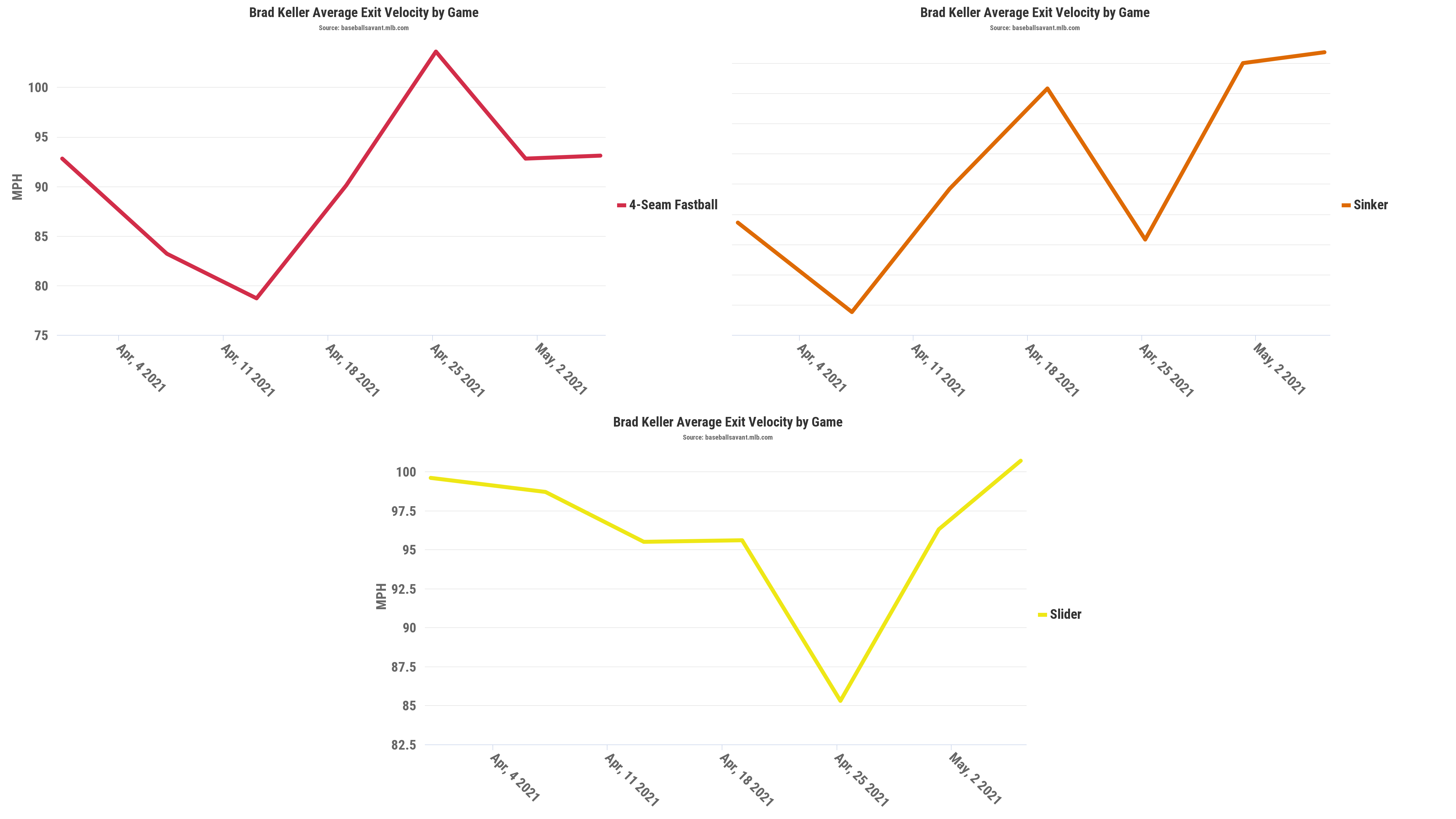 Keller threw the fastball 46 percent of the time, with eight put in play. His average exit velocity was down a bit from his start against Detroit from the end of April, but at 93.1 mph, still well ahead of where he has been in the past. The sinker and slider were thrown 27 percent and 23 percent of the time, respectively. As you can see from the charts above, both pitches were hit harder on Friday than at any other time of the season.