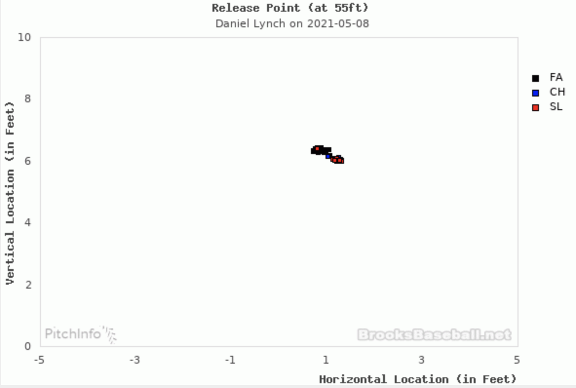 Again, this isn’t a perfect comparison because of the camera bobble between the two deliveries. But it sure looks like Lynch’s arm is higher on the release of his fastball. It’s lower on the slider. Release point data collected from Brooks Baseball confirms that Lynch was throwing his slider and fastball from two different release points.