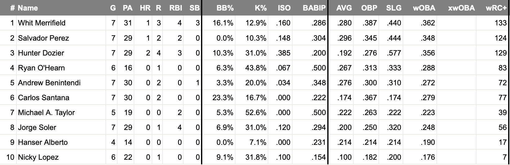 Do you want to see something gross? From Fangraphs, here’s how the Royals hitters did in the just-completed homestand.