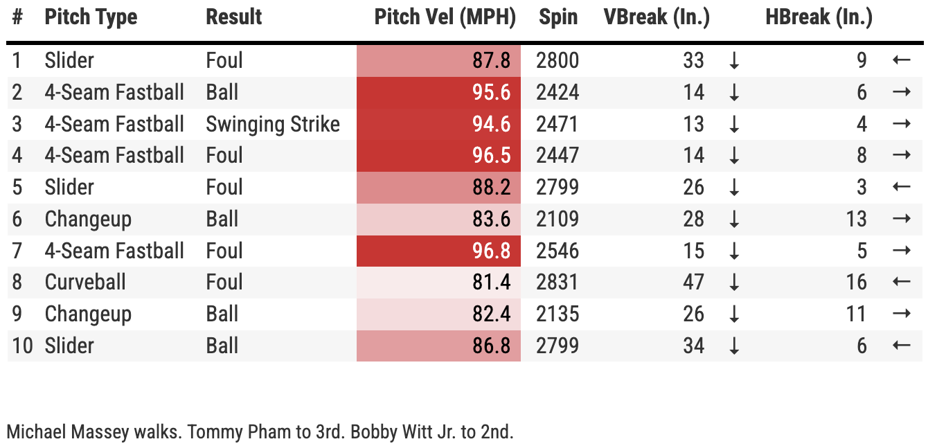 Tommy Pham led off with a liner in the gap enabling him to wheel into second. That’s a good start! With first base open and the other eight guys in the lineup struggling with the bat, Guardians starter Tanner Bibee rightly chose to work around Witt, throwing everything off the outside edge hopeful that he would fish, but probably just fine that he kept the bat on his shoulder. With the way this offense is sputtering, I’d walk Witt every single time.