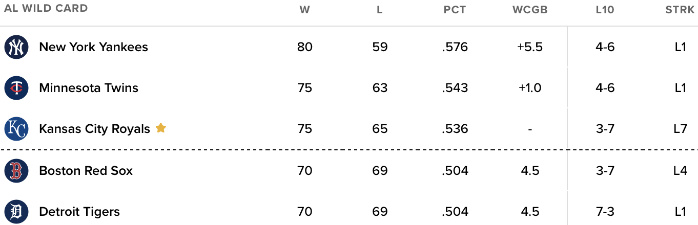 Stumbling to the finish line when you’ve been in a top-three place isn’t ideal, but the idea is just getting across that line and protecting your spot. We know from watching games this week that a 4.5-game lead can quickly evaporate, but we also know that it takes two teams to make that happen. Nothing is guaranteed, but I’d much rather be in the Royals’ position on September 4 than the Red Sox’s.