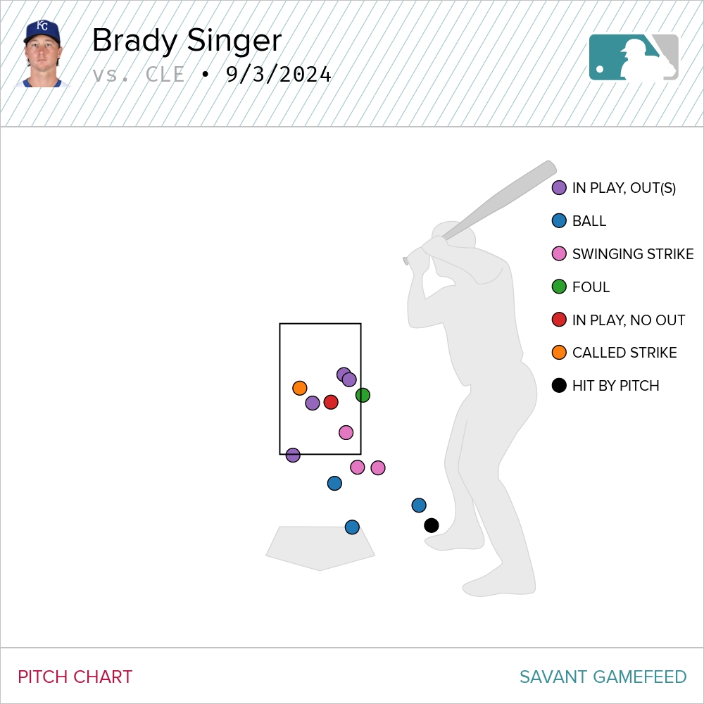 It’s an interesting chart in that the results follow what you would imagine given the location. With switch-hitters and an expanded roster, Cleveland was able to stack their lineup with left-handed bats against Singer. When the pitch bores down and in to the lefty, it has a high potential for a whiff. When it’s up, contact will be made. The thing is, it will be weak contact. Guardian hitters put five sweepers in play with an average exit velocity of 80 MPH. The sweeper is developing into a really good pitch for Singer.