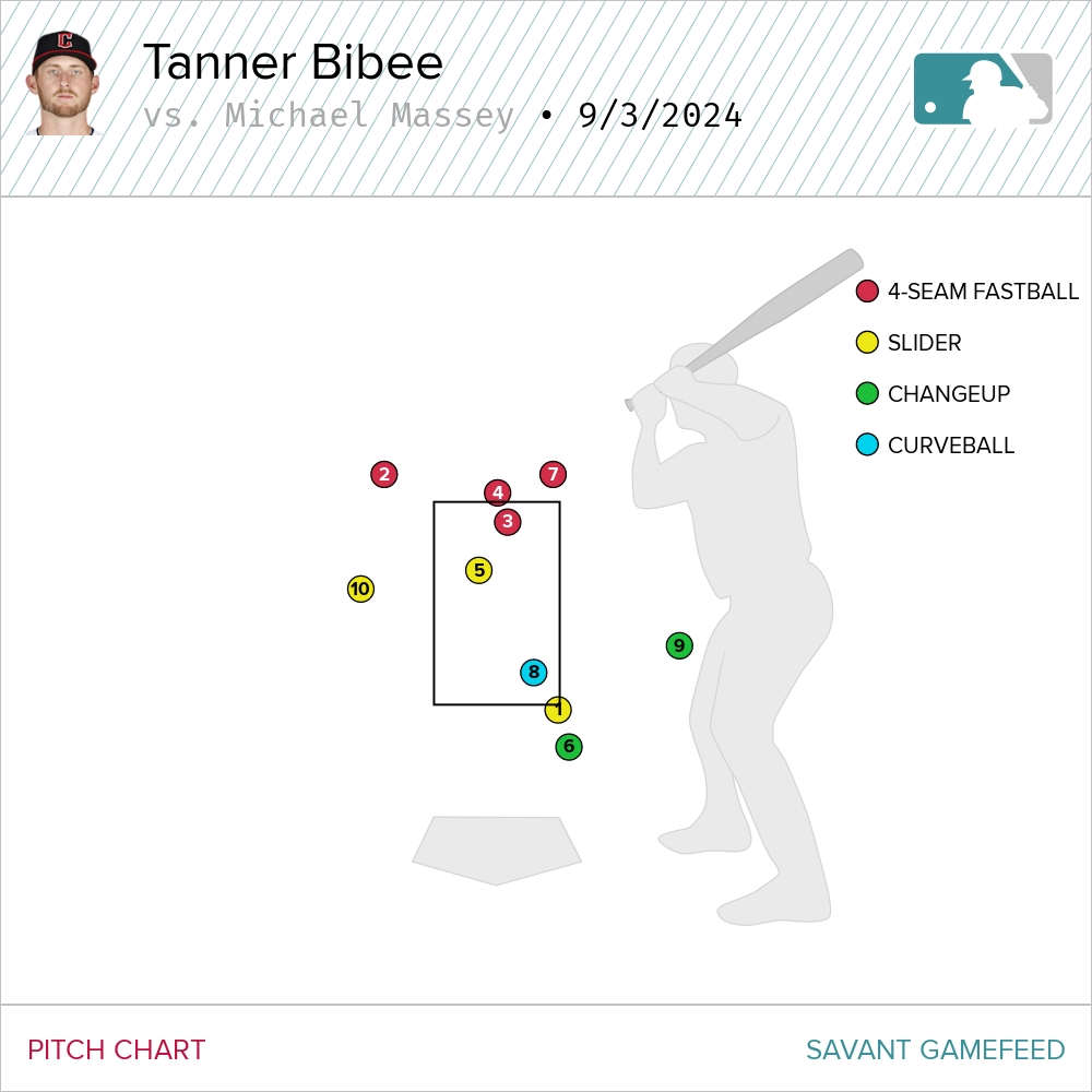 Massey fouled off several pitches, including a couple of high fastballs. For some reason, Bibee decided to go to the breaking or offspeed stuff and delivered a change well inside that almost plunked Massey before following that up with a slider that never challenged the zone.
