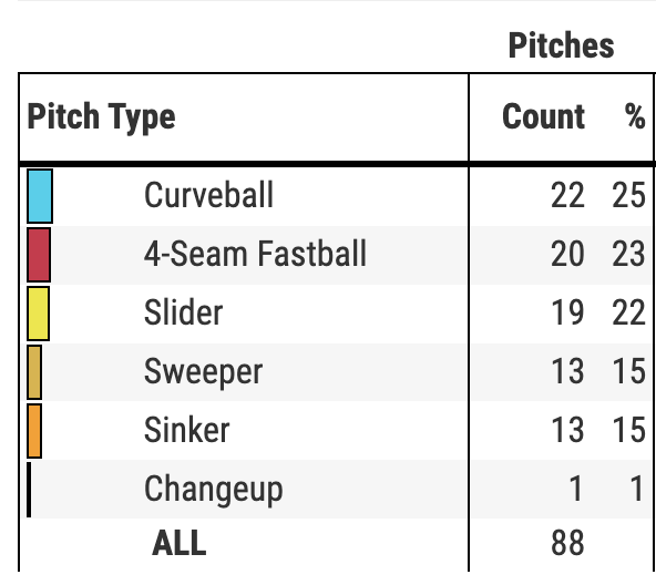 From Baseball Savant, here’s his pitch breakdown in his first start since adding a curve and modifying his slider at times to throw a sweeper.