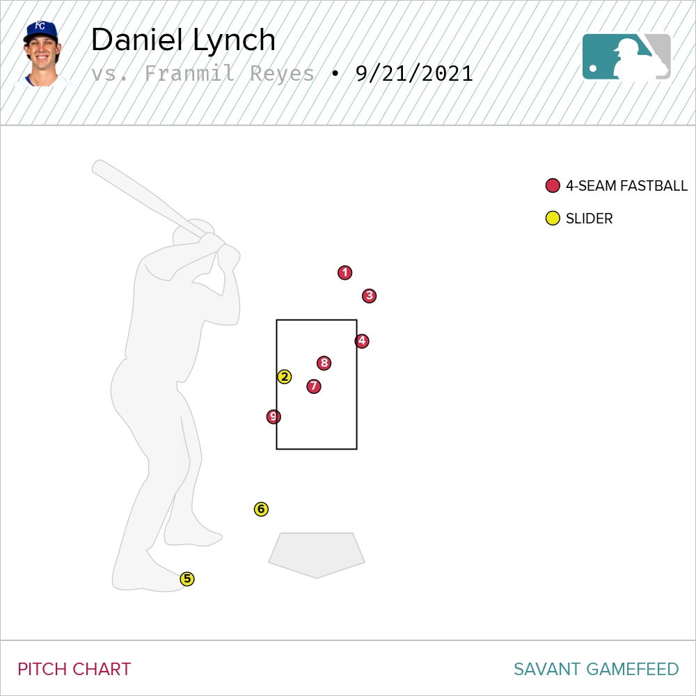 He’s still missing here with the fastball up and the slider down. But what is so intriguing about this pitch chart after the first two is how Lynch is slowing dialing it in. In hindsight, it’s easy to point to this at bat as the one where Lynch got everything together, because in the moment it still felt like he was living on the edge. But this pitch, the diving and driving fastball on the inside corner for a called strike three after Reyes couldn’t handle couple of get-me-over full-count heaters was the stuff.