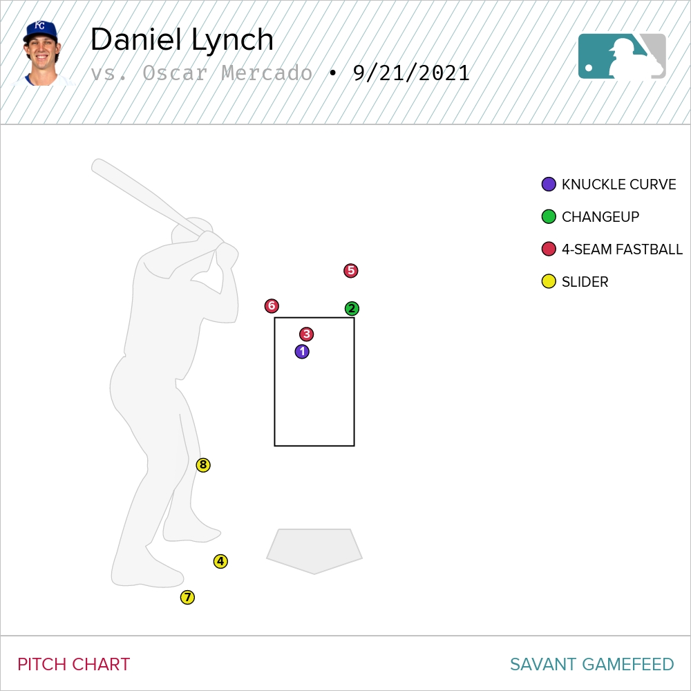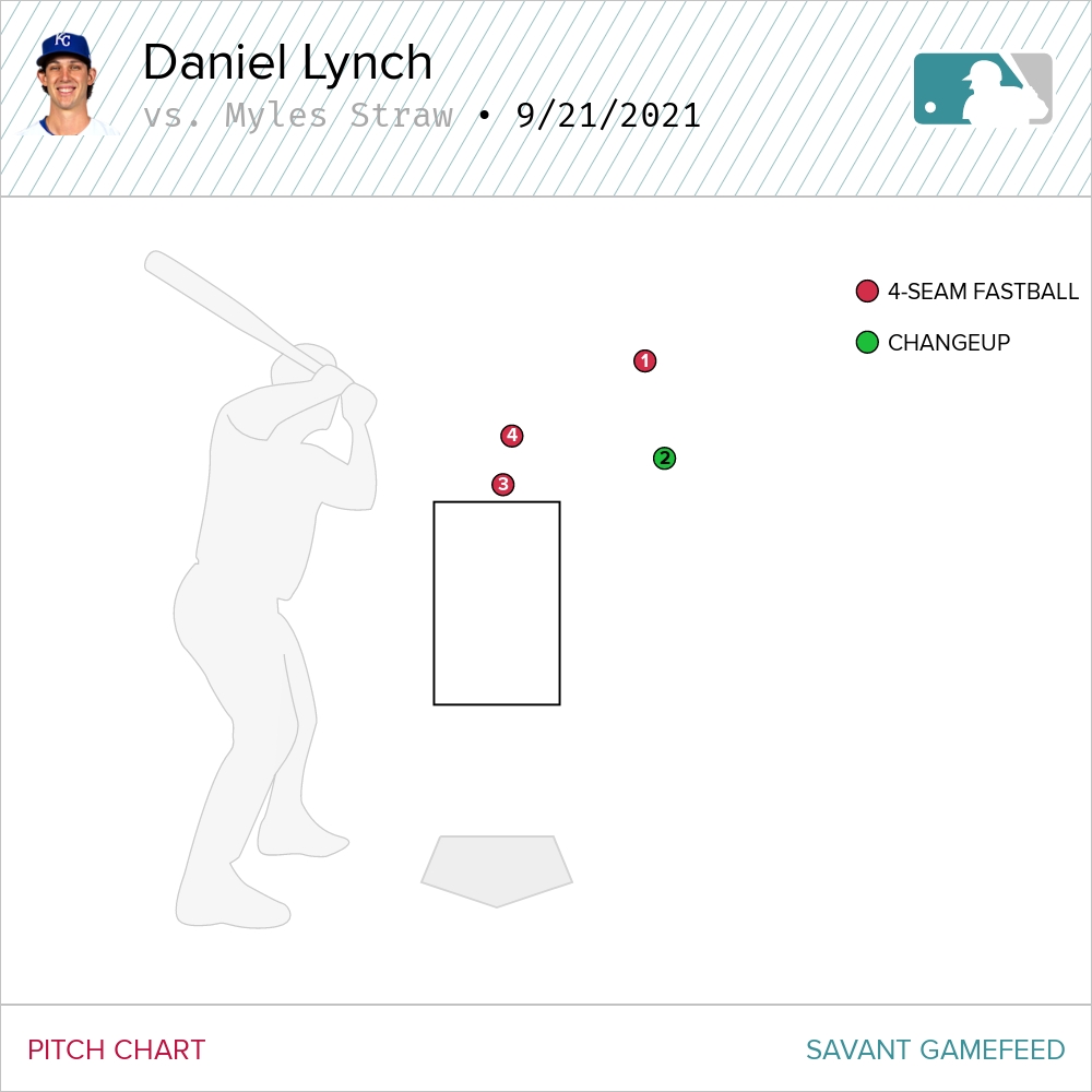 The adjustment Lynch made in the later innings was to depend primarily on his four-seamer. It wasn’t pretty. It wasn’t one of those “hang this in the Lourve” outings we salivate over when everything is clicking. This was pure survival mode. Primal pitching where Lynch was just flicking 93 mph heaters up there and getting by on guts. In the fifth and sixth inning, it was primarily the four-seamer. Lynch threw it almost 65 percent of the time over the final two frames.