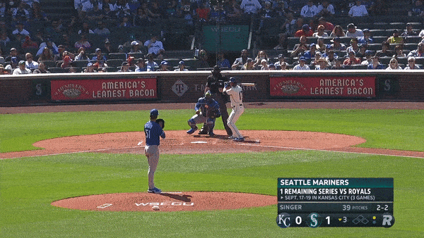 He didn’t really have command of the pitch, missing Perez’s target frequently. For the change he hit Mitch Haniger with in the third, Perez set his target low and away, Singer came up and in.