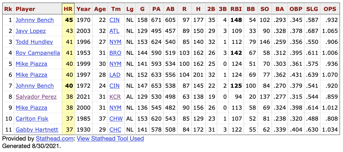 Speaking of which, the above homer was number 38 on the season. It’s time to update the single-season home run record board for catchers because Perez has overtaken the fast lane of this freeway.