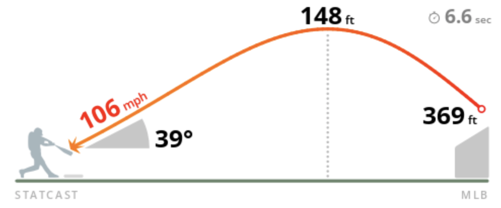 The swing is a thing of beauty to be sure, but from this angle and at this speed, you get a taste of the launch angle. Honestly, if you saw this gif and didn’t know the outcome, what would you think happened? It sure looks like a harmless fly ball to left. Except when the batter is Salvy Strong, that harmless fly ball has some kind of carry. Indeed, his dinger on Sunday left the bat at a launch angle of 39 degrees. It’s apex reached 148 feet. The ball left the atmosphere.