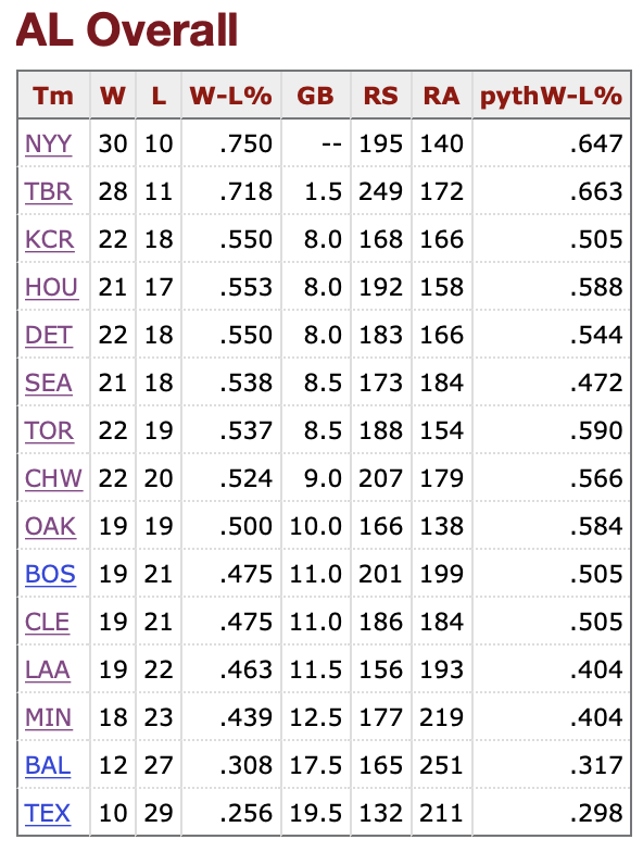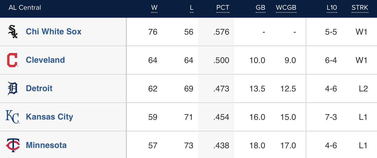 This is an intriguing table. For one thing, their Royals 168 runs scored since the break is the fewest among their rivals in the AL Central. Yet their 166 runs allowed is the best mark in the division, tied with the Tigers. Their +2 run differential yields a Pythagorean record ever so slightly above .500, but with the Royals four wins to the good on the break-even point, it’s not as if they’re wildly outplaying their expected record.