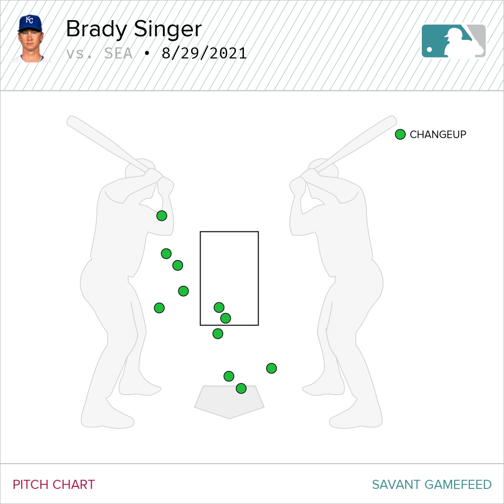 Speaking of Sunday’s game, it’s time to give a little credit where it’s due. Brady Singer is incorporating that change into his repertoire and he’s finding some success. He pitched six innings on Sunday, allowing three hits and two runs—one earned due to the Olivares error. Overall, he threw 102 pitches, of which 11 were classified as changeups.