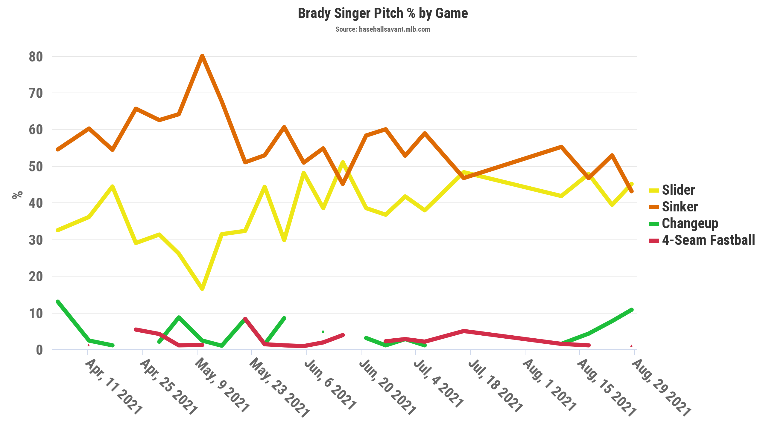 There were a couple like that that got away from Singer. The good news was he kept the ball down when he was in the zone and got a couple of ground ball outs off the pitch. Just the presence was enough to keep Seattle hitters aware. They couldn’t just sit on one pitch and adjust to another…there was an actual third pitch in the mix. This is the kind of pitch usage chart you want to see…the green line for the change is trending up.