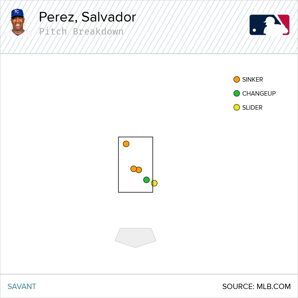 The above is the location of Perez’s last five home runs. I’ll have to continue to ask: Why is anyone throwing Perez a center-cut sinker? Good lord. The pitch he launched on Sunday was the elevated, inside sinker. This is how it looked off the bat.