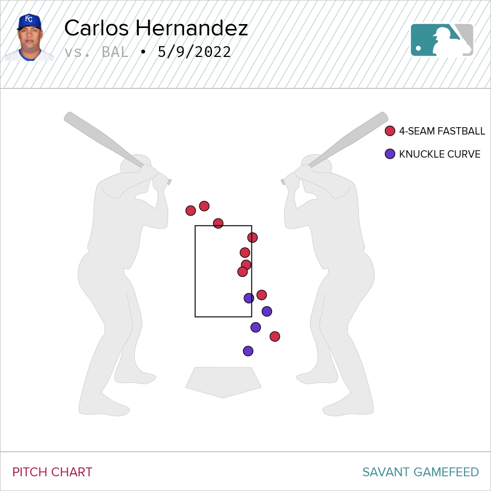 That’s just pretty. Fastballs on the edge…curves down and out of reach. If anyone is going to get the bat on one of those offerings, nothing is going to happen. Indeed, aside from the strikeout of Anthony Santander, Hernández retired Cedric Mullins on a 74 MPH ground ball and Trey Mancini on a 69 MPH lineout.