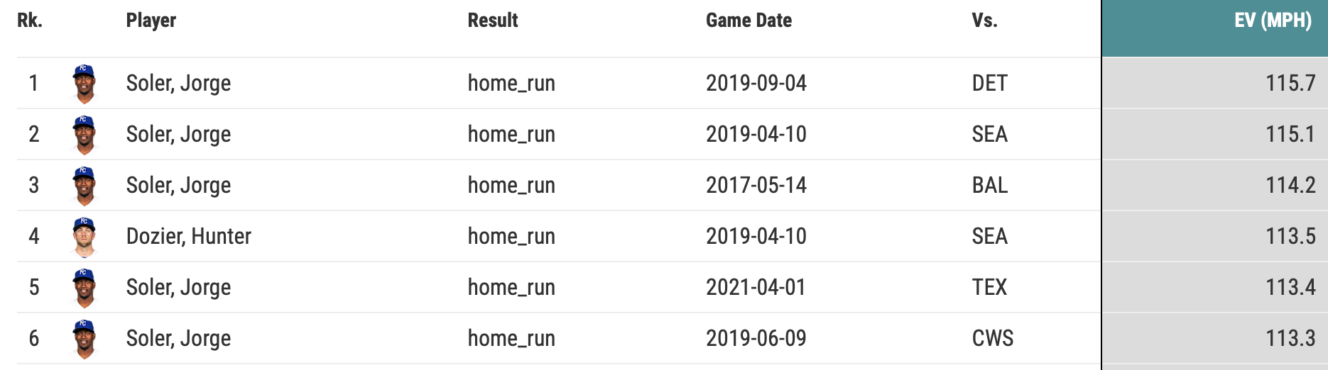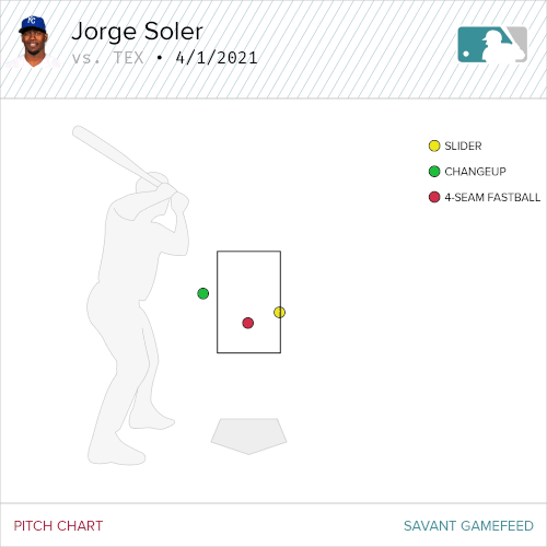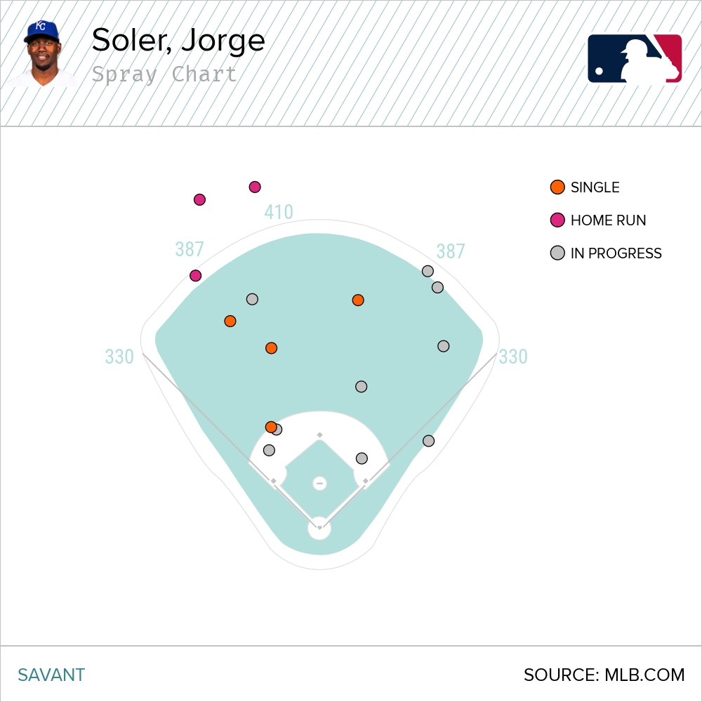 (Not sure why it has “In Progress” for the grey plots. That should read as “Field Outs.”) For Soler to take a pitch in that location and to hit a dinger to the right side of the batter’s eye? On a day when really, the ball shouldn’t have been flying out of The K? That’s some kind of power.