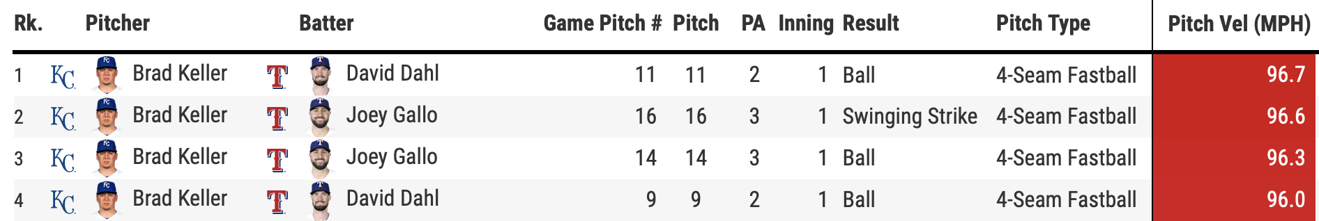 On Thursday, Keller threw four pitches 96 mph or faster, topping out at 96.7 mph.