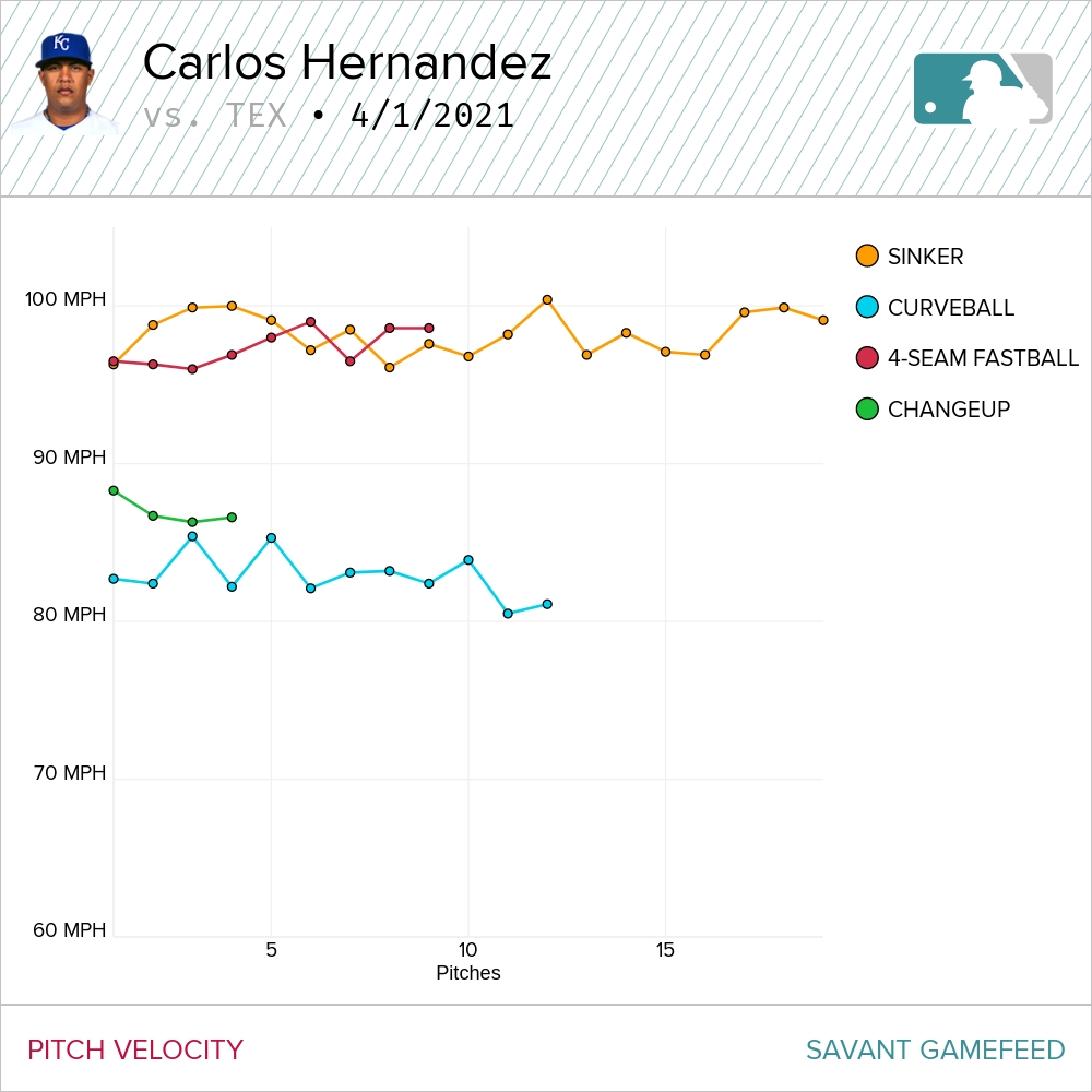 So…many…stories. Davis made his return to The K, faced two batters, threw eight pitches and got two strikeouts. Most impressive was the heat. Davis’s four-seam velocity has dropped each year since 2016, bottoming out last year at an average of 91.4 mph. On Thursday, Davis fired five heaters at an average of 94.5 mph.