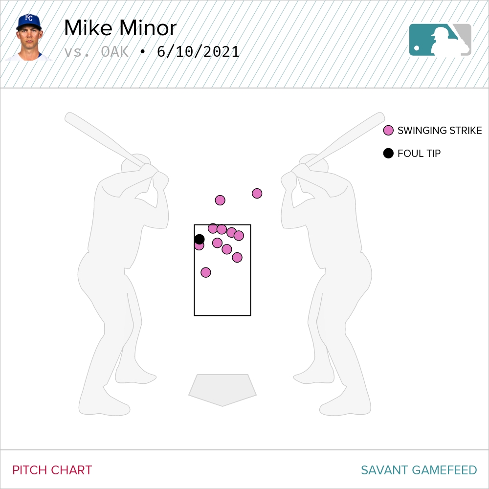 Apart from the sneaky deception of the pitch, Minor was locating really well. The fastball was mostly elevated, and usually out of the zone. Look at where those swinging strikes happened against the fastball.