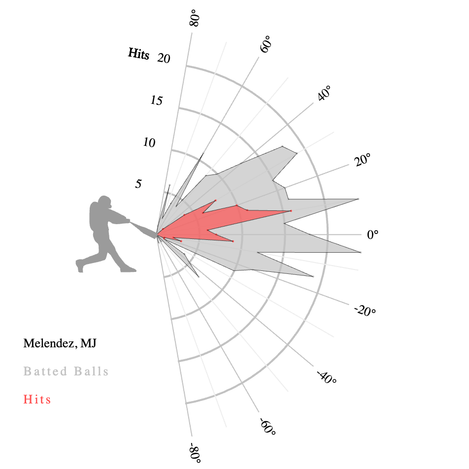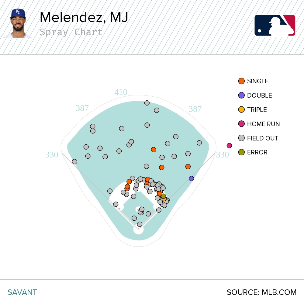 Just 33 percent of Melendez’s swing on pitches down the heart of the plate were put into play. It was 38 percent on pitches low and away. That’s not what you want. As you would expect, the results on those batted balls on pitches down and out of the zone were not exactly stellar.