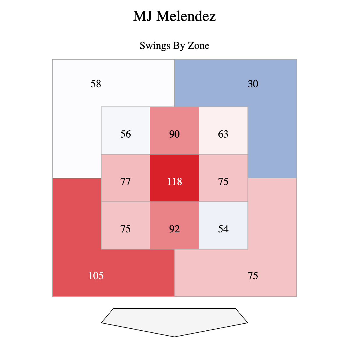 Now that we’ve looked at his revamped swing, it’s time to discuss Melendez’s approach at the plate. In 2024, he swung at more pitches low and away than any other zone besides right down the chute.