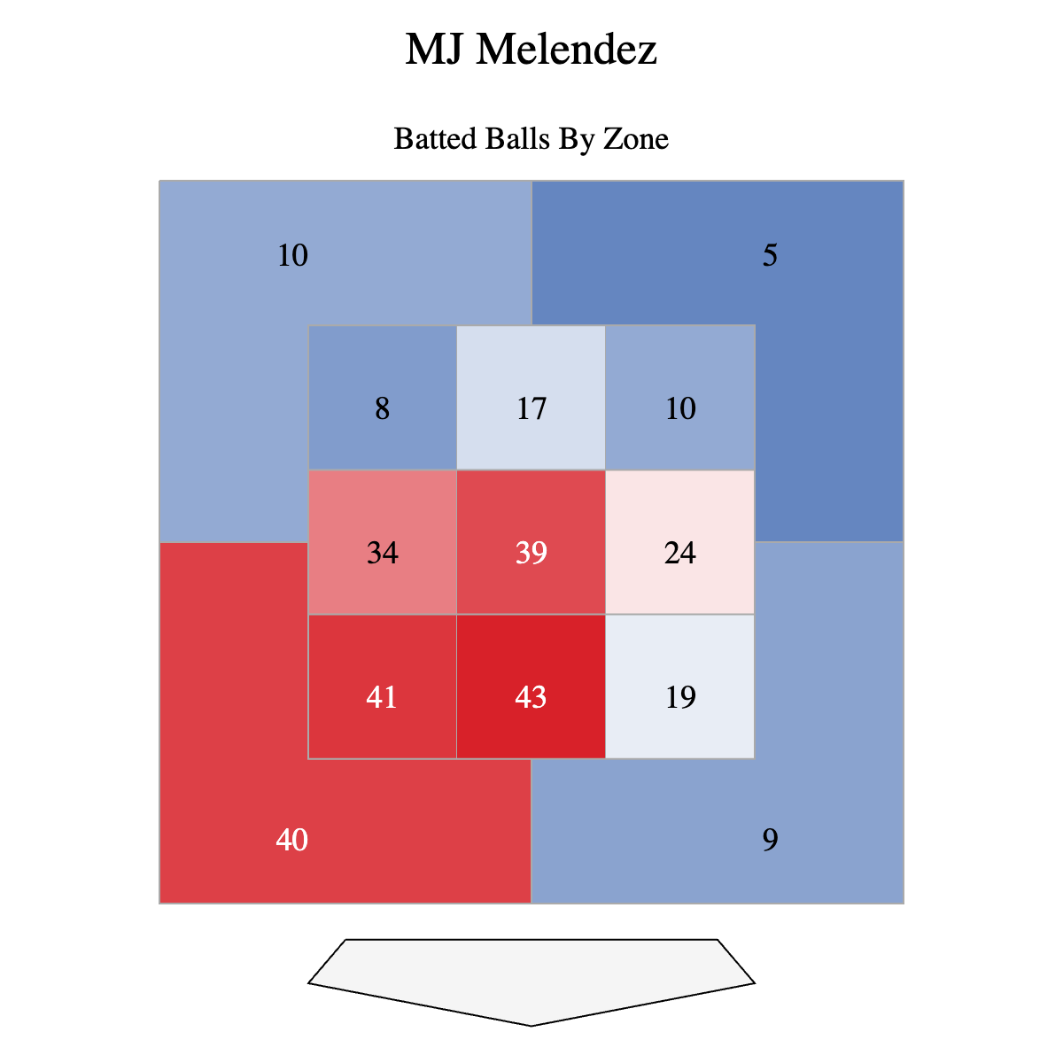 Knowing that in 2024 Melendez swung at more pitches middle-middle and low and away than any other zone, this next chart will bend your brain. It’s the number of batted balls in each zone.