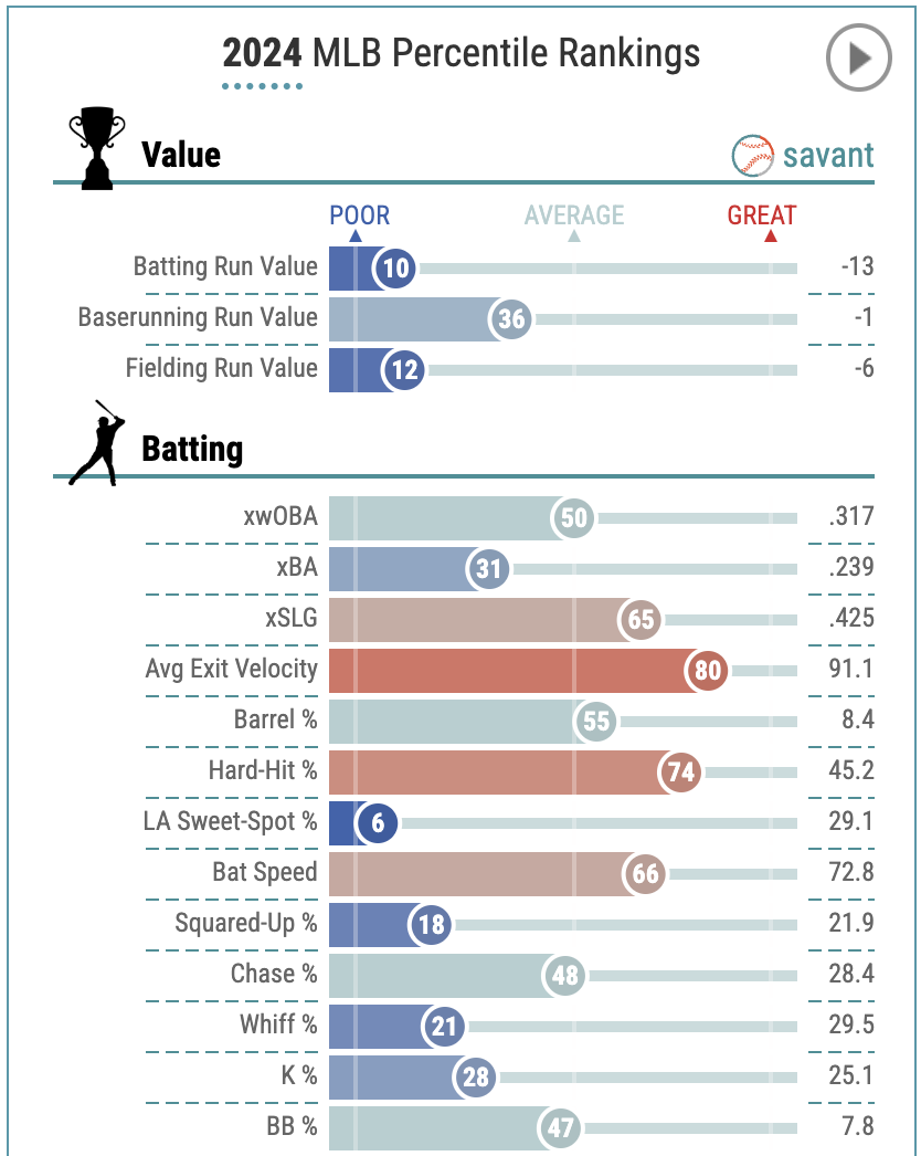 Since going off for 41 home runs in 2021 in a season split between Double and Triple-A, Melendez has failed to meet his power expectations in the big leagues. In fact, Melendez has regressed each season he’s been in the majors. In 2024, he posted career-worst rates for batting average and on-base percentage. His strikeout rate hovered around a quarter of all plate appearances which was right in line with how he’s done in his career, but his walk rate took quite a tumble. Although his .400 slugging percentage was the highest of his career by a couple of points, his OPS+ has dropped in each of his two seasons since his rookie campaign in 2022. His overall batting numbers have been rather pedestrian.
