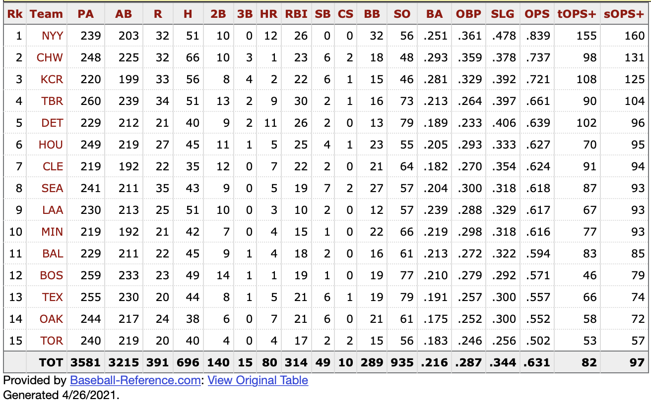 Again, the key column to look at here is the last one—sOPS+. That’s the OPS+ (anything greater than 100 is better than league average) for the split. So the Royals, with a 125 sOPS+ are 25 percent better than the average AL team when it comes to OPS+, ranking third in the league. Last year, the Royals’ seven through nine were 12th out of 15 teams with an sOPS+ of 87.