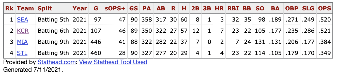 Here are the worst-hitting lineup spots in 2021. I set the parameters on this search at Baseball-Reference for a sOPS+ (the OPS+ calculated against the league split) to 50 or worse. Turns out there are only four teams with a spot in their lineup carrying a sOPS+ of below 50. Two of them, as you would imagine, are National League teams with the ninth spot reserved for pitchers hitting.